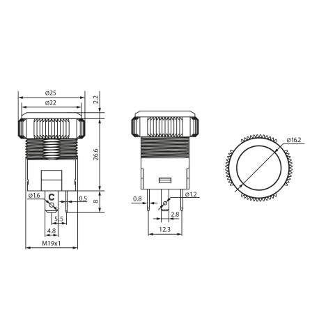 Buton de comandă incorporabil, model circular. Arie largă de utilizare, fiind incorporabil în orice panou de comandă ale aparatelor electrice. În stare de repaus ND (Normal Deschis) - în stare apăsată NI (Normal Închis), cu iluminarea butonului activ.