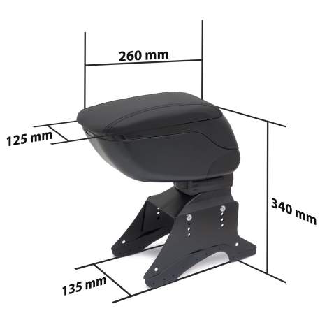 Cotiera universala auto, suport brat. Montare fara suruburi in majoritatea autoturismelor. Partea superioara a cotierei poate fi rabatuta, sub ea existand un compartiment de depozitare mai mare, ideal pentru a gazdui diferite obiecte. Partea superioara este executata din material moale, este amovibil inspre partea din fata, putand fi astfel reglata dimensiunea potrivita pt. cea mai comoda calatorie. Este mai usor sa accesati si sa manevrati schimbatorul de viteze. Cu ajutorul butonului din partea inferioara a compartimentului de depozitare puteti regla inclinatia de baza a cotierei, asigurand o pozitie potrivita pt. majoritatea autoturismelor.