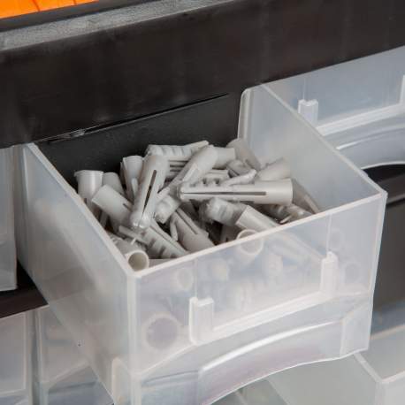 Puteti lucra eficient numai in conditii ordonate! Cu ajutorul acestui organizator portabil, puteti pastra separate pe marimi si tip piese mici, suruburi, dibluri, cuie, intrerupatoare sau alte componente electronice necesare pentru lucrari. Datorita elementelor de divizare, puteti separa pana la 24 de tipuri de accesorii. Sertarele transparente si detasabile ofera o vizibilitate buna.