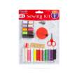 Cu fire în mai multe culori, foarfecă, bandă de măsurare de 64 cm, 10 ace de cusut, 4 butoni, degetar din plastic pentru a preveni accidentele.