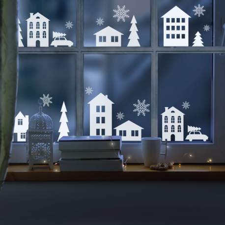 Un decor vesel pentru fereastră de Crăciun - va crea o atmosferă de sărbătoare. Poate fi aplicat și îndepărtat cu ușurință fără a lăsa urme. Unele părți ale autocolantului sunt decorate cu sclipici.