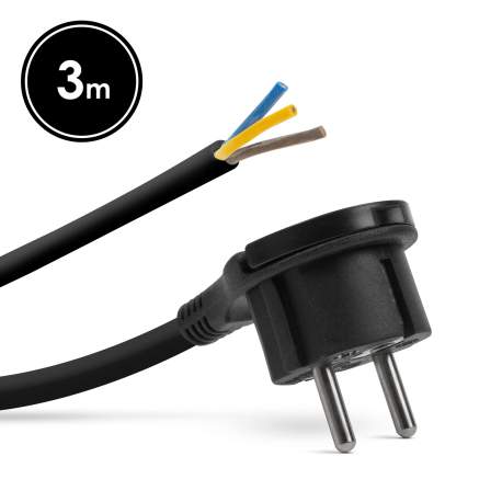 Cablu de alimentare cu împământare și terminație nemontată. Conectorul are o clemă de plastic care facilitează deconectarea ștecherului de la rețea. Ideal pentru alimentarea cu energie electrică a dispozitivelor de interior.