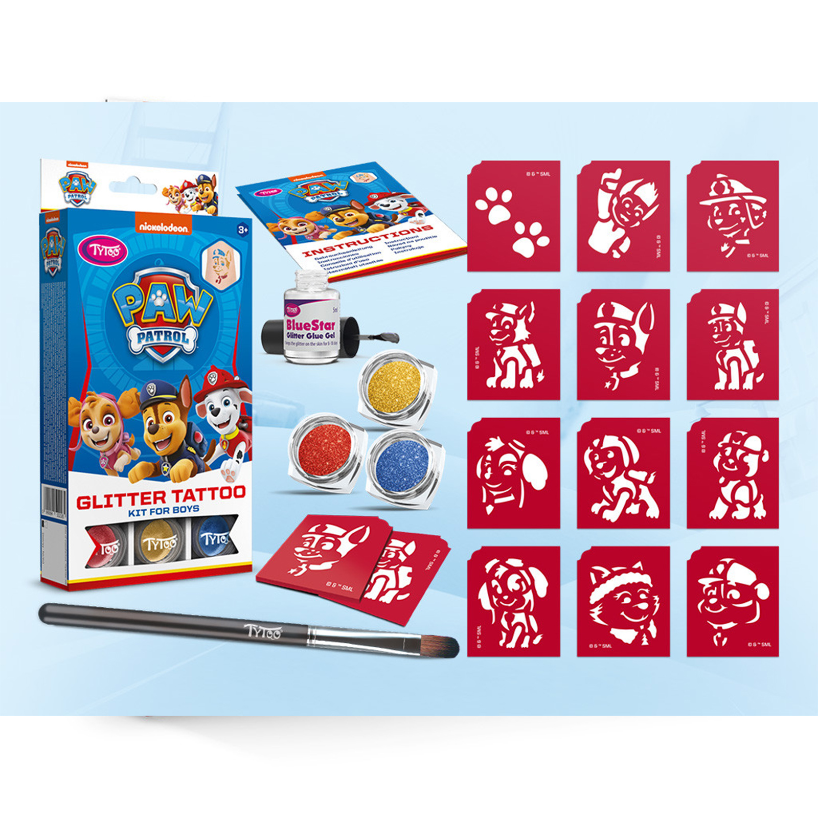 Cu ajutorul șabloanelor incluse în pachet poți crea modele de tatuaje cu sclipici Paw Patrol, pe care le poți folosi și pentru alte picturi corporale. Aproape fiecare copil este fan Paw Patrol, în care personajele îi salvează eroic pe cei care au probleme în fiecare episod. Protagonistul, băiețelul Ryder, și câinii săi deștepți se confruntă cu provocări neobișnuite în Adventure Bay, din care ies mereu învingători.