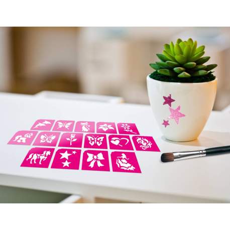 Conținutul pachetului: | 15 buc șablon 1 buc gel adeziv BlueStar 2 buc pudră cosmetică cu sclipici 1 buc perie 1 buc manual de utilizare |