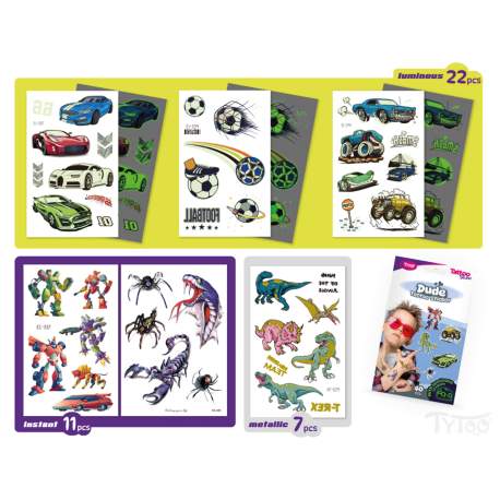 Usor de aplicat, tatuaje simple si spectaculoase, intr-un set. Aceste autocolante cu tatuaje temporare sunt de înaltă calitate, astfel încât își păstrează culoarea și detaliile vii pentru o lungă perioadă de timp, chiar și zile. Sunt ușor de aplicat și îndepărtat fără a irita sau deteriora pielea. 40 de tatuaje diferite cu autocolante pe 6 foi: Mașini, Transformers, fotbal, șerpi, scorpioni și bineînțeles dinos.