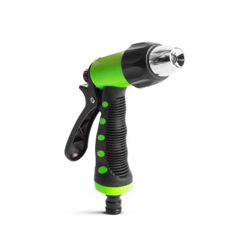 Pistol de stropire din plastic de înaltă calitate, cu 3 tipuri de jeturi de apă, astfel încât veți fi garantat să îl găsiți pe cel potrivit. Cu ajutorul cuplajului cu conectare rapidă, acesta poate fi transportat cu ușurință de la un capăt la celălalt al furtunului de irigare. Datorită brațului de sprijin, nu este necesar să țineți apăsat trăgaciul pe toată durata udării.