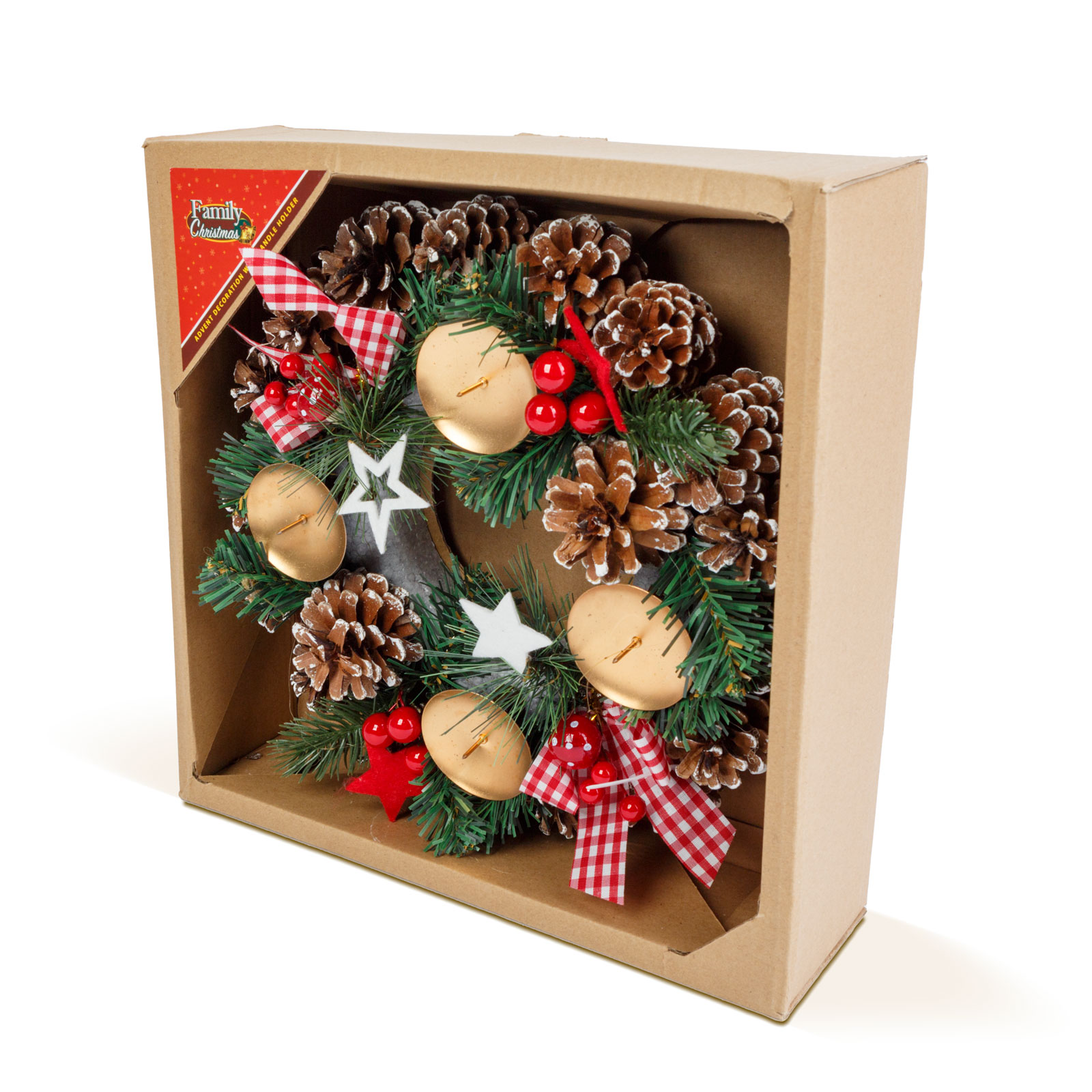 Creează o atmosferă de Crăciun în casa ta cu acest decor uimitor de masă. O coroană de Advent clasică, circulară, care arată bine pe orice masă festivă. Datorită bazelor de lumânare din compoziție, o poți folosi în siguranță cu lumânările la alegere. Plantele, conurile și panglicile artificiale aranjate armonios creează o atmosferă colorată și festivă. Un instrument decorativ excelent care poate fi folosit pe scară largă și arată bine în orice interior de Crăciun.