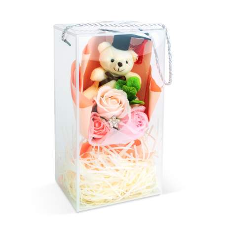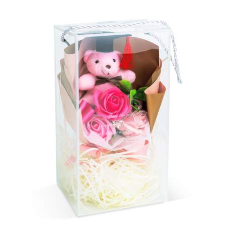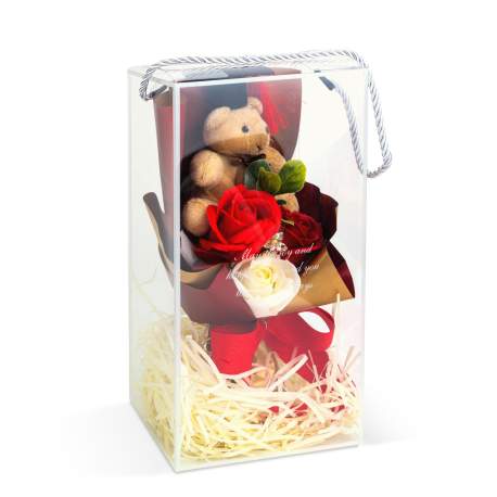 Pachetul conține un ursuleț de pluș adorabil și un trandafir, ambele ambalate în hârtie mată, cu un aspect elegant. Întreaga compoziție este livrată într-o cutie de plexiglas, al cărei fund este umplut cu fâșii de hârtie albă, accentuând nota de exclusivitate.