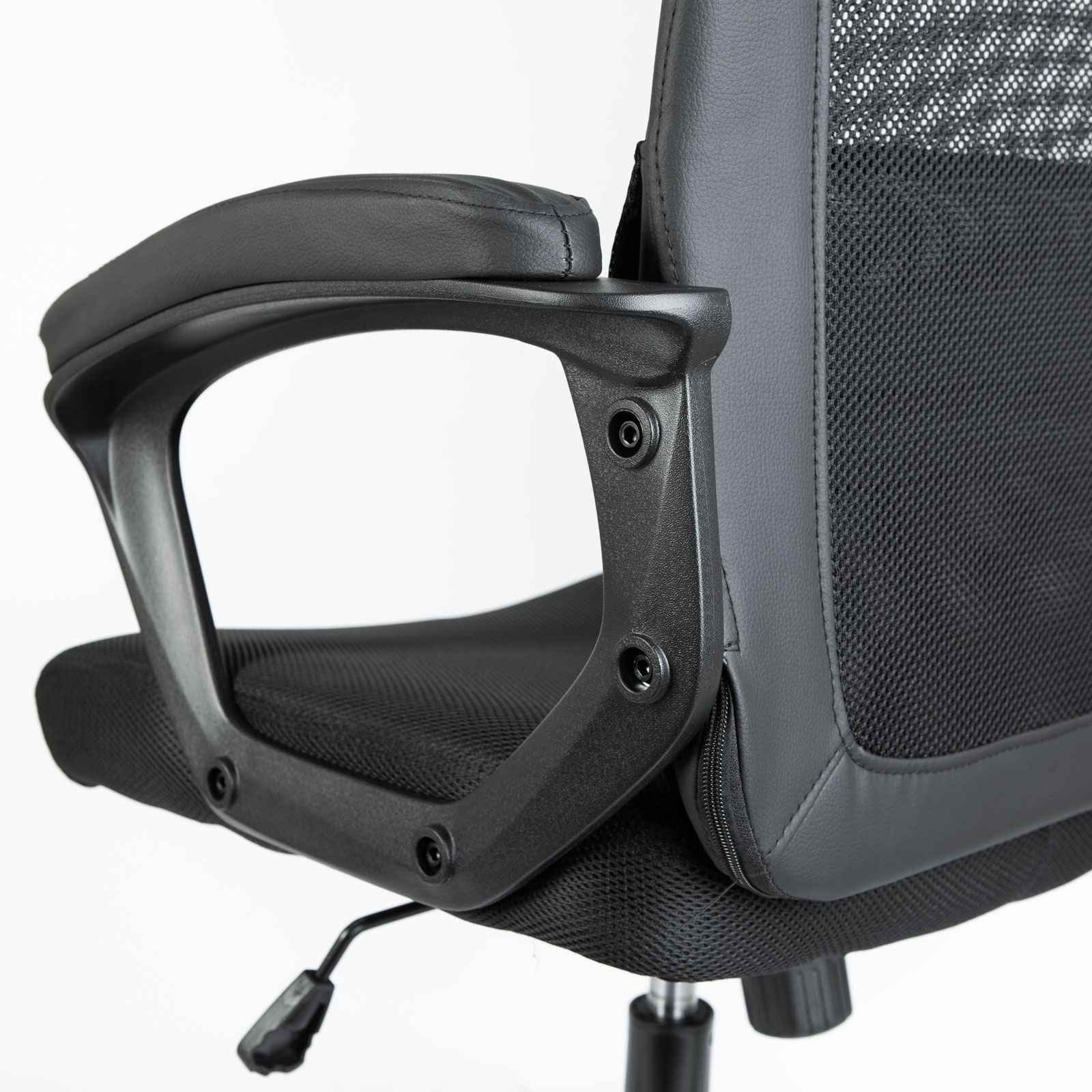 Scaunul de birou BMD1120 combină eleganța cu funcționalitatea pentru a oferi o experiență de utilizare confortabilă atât acasă, cât și la birou. Are un design modern, complet negru, cu tetieră integrată și brațe fixe căptușite. Spătarul este din material tip plasă, flexibil și respirabil, în timp ce șezutul este construit pe bază de lemn stratificat, acoperit cu burete moale pentru un plus de confort. Înălțimea este ajustabilă prin gazlift, iar baza metalică cu roți asigură stabilitate și durabilitate ridicată în utilizare zilnică.
