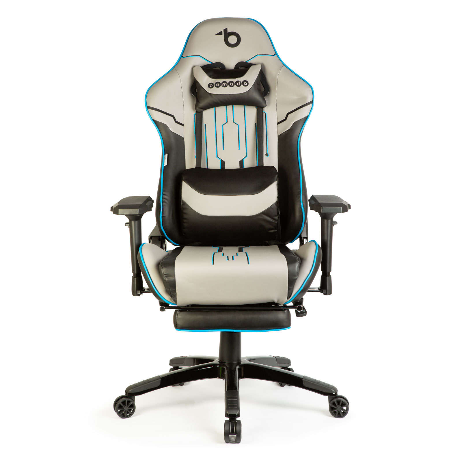 Scaunul de gaming BMD1118A este alegerea ideală pentru sesiuni lungi de joc sau lucru intens, oferind un nivel premium de confort și susținere. Designul modern, în combinație de gri, negru și albastru, este accentuat de detalii sport și linii agresive, specifice stilului gamer. Scaunul este dotat cu spătar rabatabil între 90° și 180°, tetieră ajustabilă, pernă lombară, suport extensibil pentru picioare și cotiere 4D complet reglabile. Șezutul și spătarul sunt realizate din spumă modelată, acoperite cu PVC rezistent la uzură. Baza metalică cu cinci roți garantează stabilitate și mobilitate ridicată.