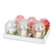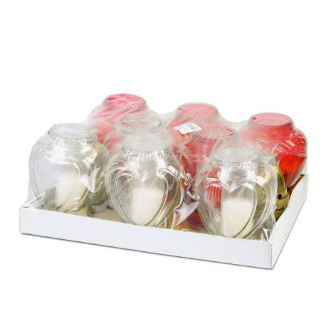 Această lumânare din sticlă în formă de inimă este un simbol al respectului și reculegerii, potrivită pentru comemorări, sărbători sau vizite la cimitir. Recipientul din sticlă, colorat în roșu și alb, oferă un aspect deosebit și elegant, în timp ce capacul auriu din plastic protejează flacăra de vânt.