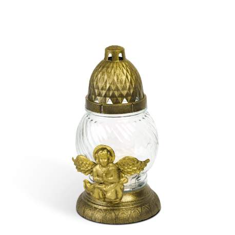 Această lumânare din sticlă cu motiv îngeraș este un simbol al respectului și liniștii, potrivită pentru comemorări, sărbători religioase sau vizite la cimitir. Recipientul transparent din sticlă îi oferă un aspect elegant și sobru, iar capacul negru cu efect auriu antichizat protejează flacăra și o face mai rezistentă la vânt.