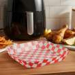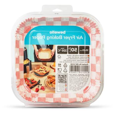 Această hârtie de coacere special concepută pentru air fryer, cu dimensiunile de 23 x 23 cm, formă pătrată și model în carouri, oferă o soluție practică pentru gătit. Fabricată din hârtie de 40 gsm, rezistentă la temperaturi de până la 220°C, previne lipirea și arderea alimentelor de coșul de gătit, păstrând gustul intact și reducând pierderile de mâncare. Este ideală pentru utilizare în air fryer, cuptor electric, microunde sau aparate de gătit cu aburi, fiind de unică folosință și livrată în pachete de 50 de bucăți. De asemenea, facilitează curățarea coșului, prelungindu-i durata de viață.