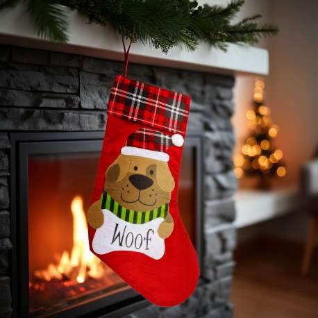 Această șosetă decorativă este alegerea ideală pentru iubitorii de animale care doresc să includă și prietenii lor necuvântători în atmosfera festivă. Modelul cu câine și inscripția „Woof” aduce un strop de veselie și originalitate în decorul tău, fiind perfectă pentru a ascunde recompense, jucării mici sau alte surprize pentru patrupedul tău.