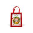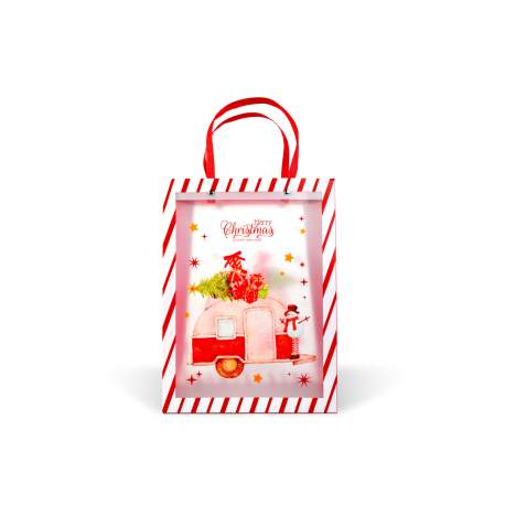 Disponibilă în două modele festive – cu rulotă sau cu coroniță decorativă –, punga are o nuanță bordo elegantă și un design translucid care îi oferă un aspect rafinat și modern. Mânerele metalice, fixate cu nituri, asigură o prindere sigură și o utilizare îndelungată.
