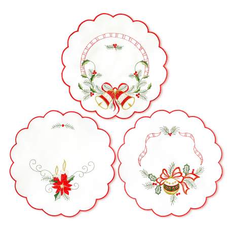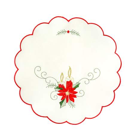 Această față de masă brodată, cu design clasic și detalii elegante, este alegerea perfectă pentru a aduce o notă festivă și rafinată mesei tale. Forma rotundă, marginile roșii și modelele brodate cu motive precum clopoței, lumânări, globuri și crenguțe de vâsc creează o atmosferă caldă și plină de farmec.
