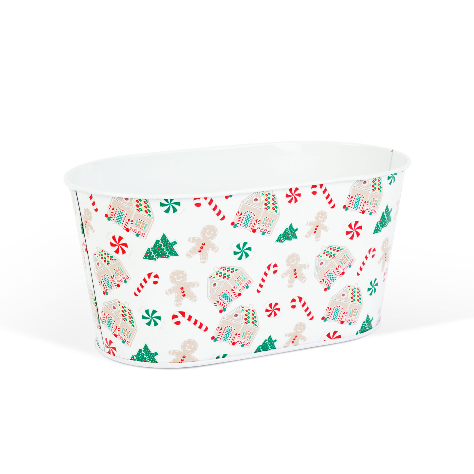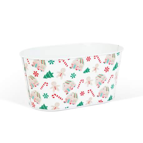 Acest coș decorativ din metal, cu model de căsuță din turtă dulce, aduce un plus de farmec și veselie oricărui decor festiv. Perfect pentru depozitarea prăjiturilor, bomboanelor, micilor cadouri sau a decorațiunilor, coșul combină funcționalitatea cu eleganța într-un design plin de culoare și detalii rafinate.