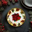 Această tavă decorativă elegantă, cu model de floare de poinsettia, adaugă un plus de farmec mesei tale festive. Cu un diametru de 22 cm, este ideală pentru servirea prăjiturilor, gustărilor, biscuiților sau a aperitivelor. Designul său clasic, cu detalii florale, ramuri de brad și conuri, creează o atmosferă caldă și elegantă.