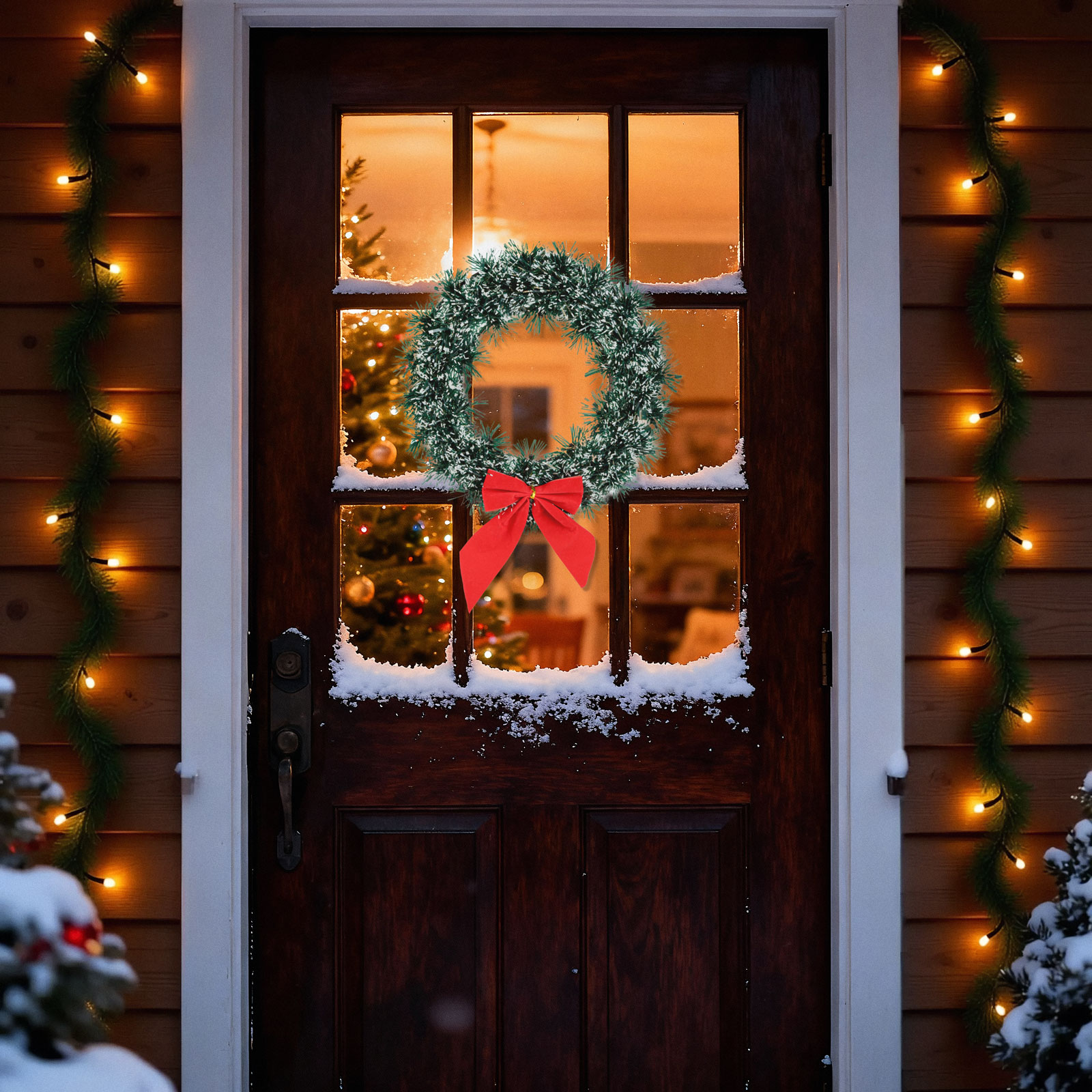 Această coroniță decorativă elegantă este alegerea perfectă pentru a aduce o notă festivă la intrarea în locuință sau în interiorul casei. Realizată dintr-un cadru solid de plastic și îmbrăcată în ghirlandă verde cu efect de zăpadă, oferă un aspect natural și plin de farmec.
