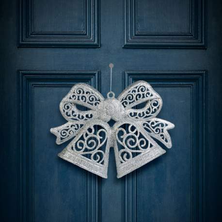 Fabricată din material plastic durabil, funda are un strat glitter care reflectă frumos lumina, aducând un farmec aparte decorațiunilor. Sistemul de prindere integrat permite o fixare rapidă și sigură, fără a deteriora suprafețele.