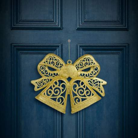 Adaugă o notă de eleganță și strălucire decorului tău festiv cu această fundă decorativă aurie, perfectă pentru brad, uși, vitrine sau spații ample. Realizată din material plastic durabil, cu un finisaj glitter rafinat, această decorațiune atrage privirile prin reflexiile sale aurii care conferă un aer sofisticat oricărui spațiu.