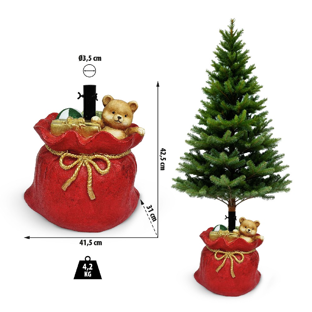 Acest suport de brad în formă de sac de Moș Crăciun nu este doar practic, ci și un element decorativ impresionant pentru pomul de Crăciun. Culoarea roșie cu șnur auriu creează o impresie realistă de sac plin cu cadouri, asigurând în același timp stabilitate pentru pom. Fabricat din piatră artificială, oferă o prindere solidă chiar și pentru brazi de dimensiuni mari.