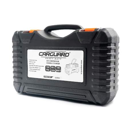 Cel mai puternic și rapid compresor auto din gama Carguard! Dublu cilindru metalic complet pentru debit uriaș de 50 L/min – umflă o roată de SUV sau furgonetă în sub 2 minute și ajunge la 150 PSI fără efort. Carcasă robustă cu mâner și lanternă LED frontală puternică, furtun aer de 3 metri, cablu lung + adaptor direct pe borne baterie pentru pornire sigură. Vine cu tot ce ai nevoie: kit reparație anvelope (4 accesorii), 3 adaptoare umflare și 4 unelte. Indispensabil pentru off-road, service-uri, drumuri lungi sau orice șofer care vrea performanță reală!