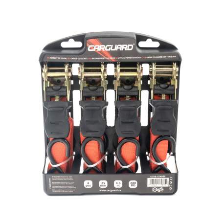 Pachet complet cu 4 chingi cu clichet în culoare roșie aprinsă – soluția perfectă pentru fixarea motocicletei, ATV-ului, bicicletelor sau încărcăturii pe remorcă, portbagaj sau platformă! Fiecare chingă are bandă poliester 25 mm ultra-rezistentă, cârlige duble S metalice acoperite cu plastic anti-zgârieturi și clichet zincat cu mâner ergonomic. Capacitate 680 kg per chingă (total set 2.720 kg). Lungime utilă 4.5 metri fiecare – compacte, ușor de depozitat și întotdeauna la îndemână în portbagaj. Certificare TUV/GS – calitate și siguranță garantată!