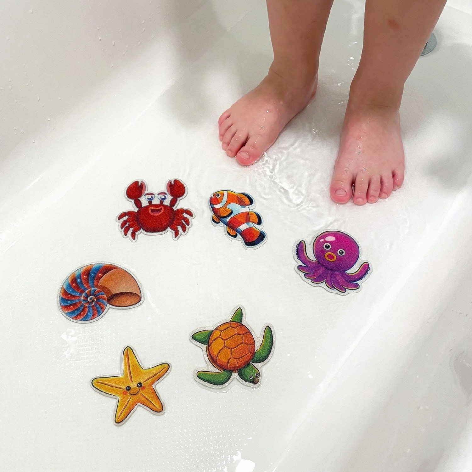 Cel mai vesel și eficient mod de a face cada/dușul sigur pentru copii și întreaga familie! Set de 6 stickere antiderapante cu 6 modele marine diferite (stea de mare, țestoasă, caracatiță, crab, peștișor clown, scoică) în culori vii (roșu, mov, galben, verde, maro). Se lipesc instant pe suprafețe netede, aderă perfect chiar și în apă/săpun, nu se dezlipesc și nu lasă urme. Material EVA + PE flexibil și durabil – protecție maximă împotriva alunecării + decor adorabil pentru baie!