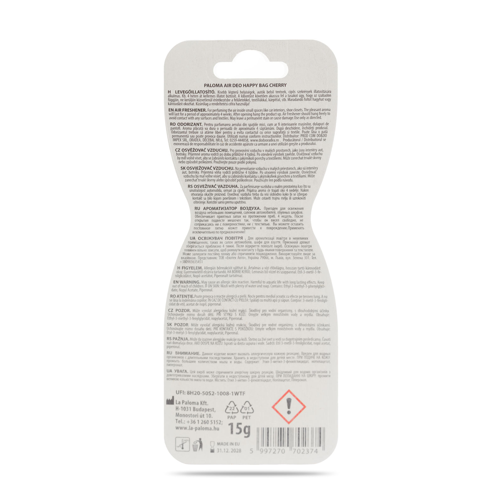 În concluzie, Paloma Happy Bag - Cherry este soluția ideală pentru a aduce aroma dulce a cireșelor în mașina ta sau în camera ta. Transformă-ți spațiul într-un loc plin de dulceață și savoare cu acest produs plin de aroma delicioasă!