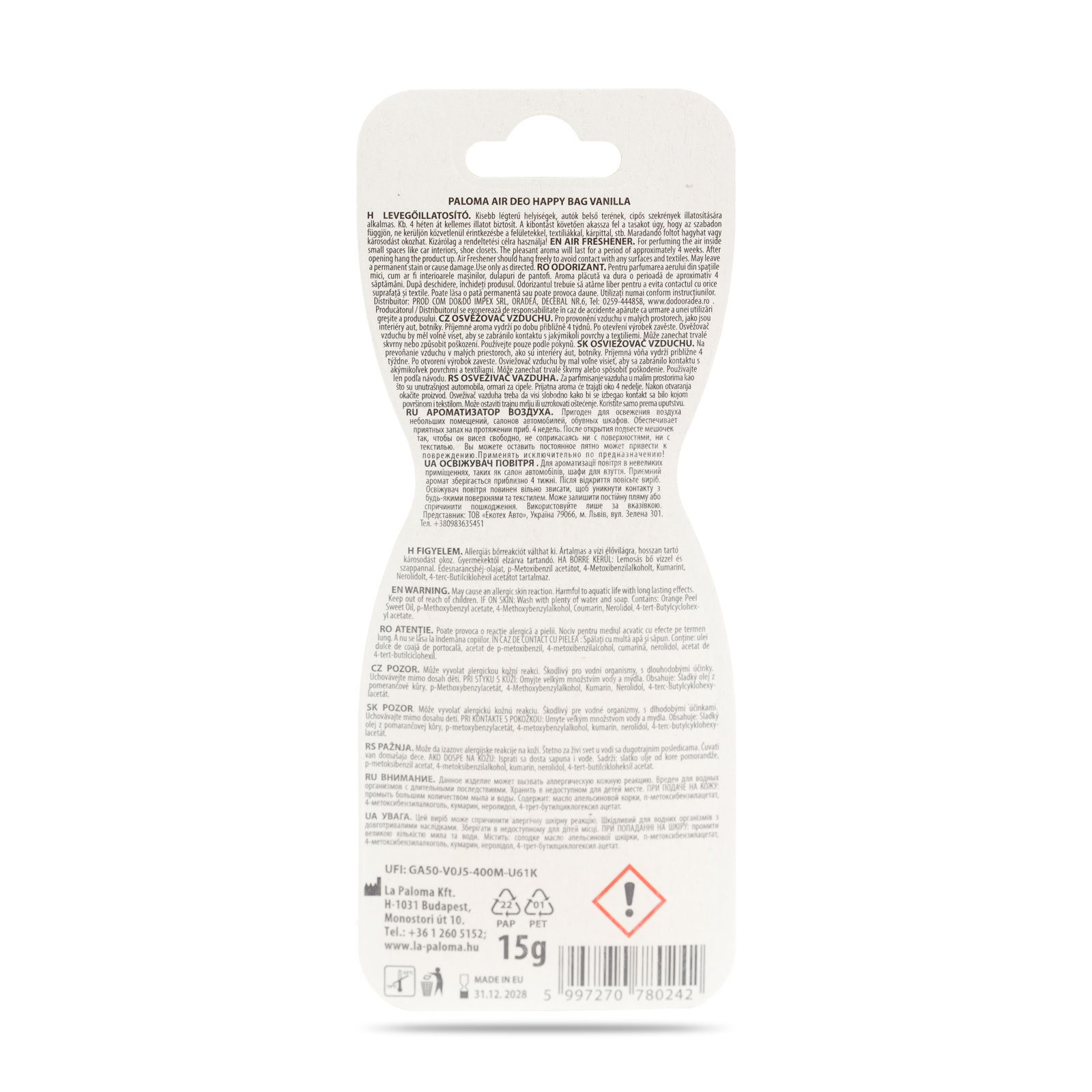 În concluzie, Paloma Happy Bag - Vanilla este soluția ideală pentru a aduce dulceața și căldura vaniliei în mașina ta sau în camera ta. Transformă-ți spațiul într-un loc plin de confort cu acest produs plin de dulceață!
