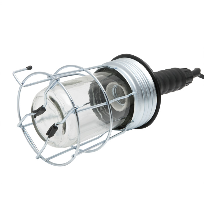 -60W E27 socket-Operated 220-240V/50Hz-CEE-7/7 16A/250V AC plug-IP20-protected-Protected with glass light diffuser and metalic basket-5m H07RN-F 2x0.75mm2 rubber coated cable and hanger