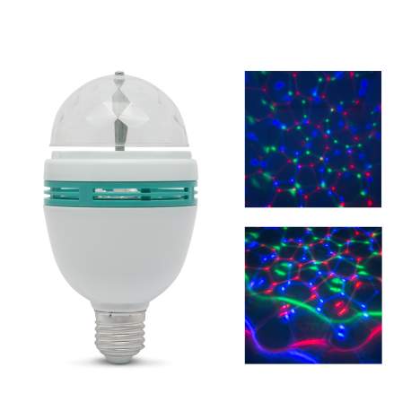 Becul LED model "Glob discoteca" creeaza atmosfera de petrecere in orice incapere. Datorita miscarii de rotatie, globul creeaza o varietate infinita de efecte luminoase colorate, variind intensitatea LED-urilor rosii, verzi si albastre.