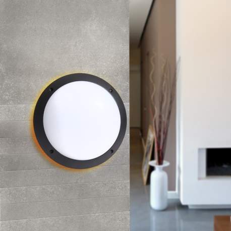 Lampa murala model rotund, in executie antisoc si anticorozva, rezistenta la radiatii UV, cu soclu E27.