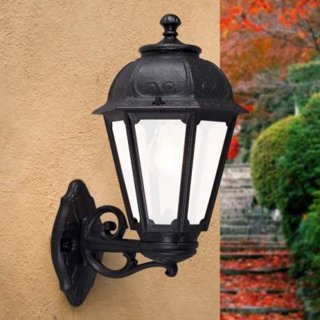 Lampa murala hexagonala, in stil clasic, in executie antisoc si anticorozva, rezistenta la radiatii UV, cu soclu E27.